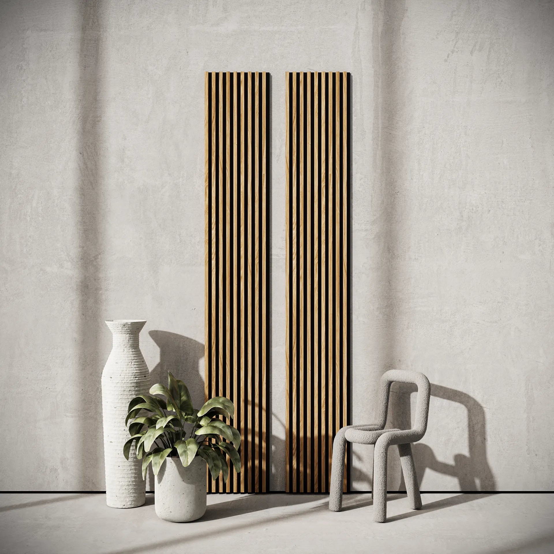 Panourile acustice de perete sunt o modalitate la modă și practică de a vă decora interiorul! Datorită pâslei groase de 8 mm și lamelelor verticale, panourile absorb undele sonore perfect, eliminând reverberația din cameră. Pe lângă funcțiile acustice, panourile acustice servesc și ca decor la modă și modern al pereților și tavanelor în orice interior.